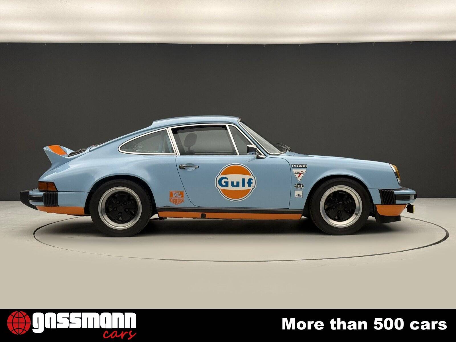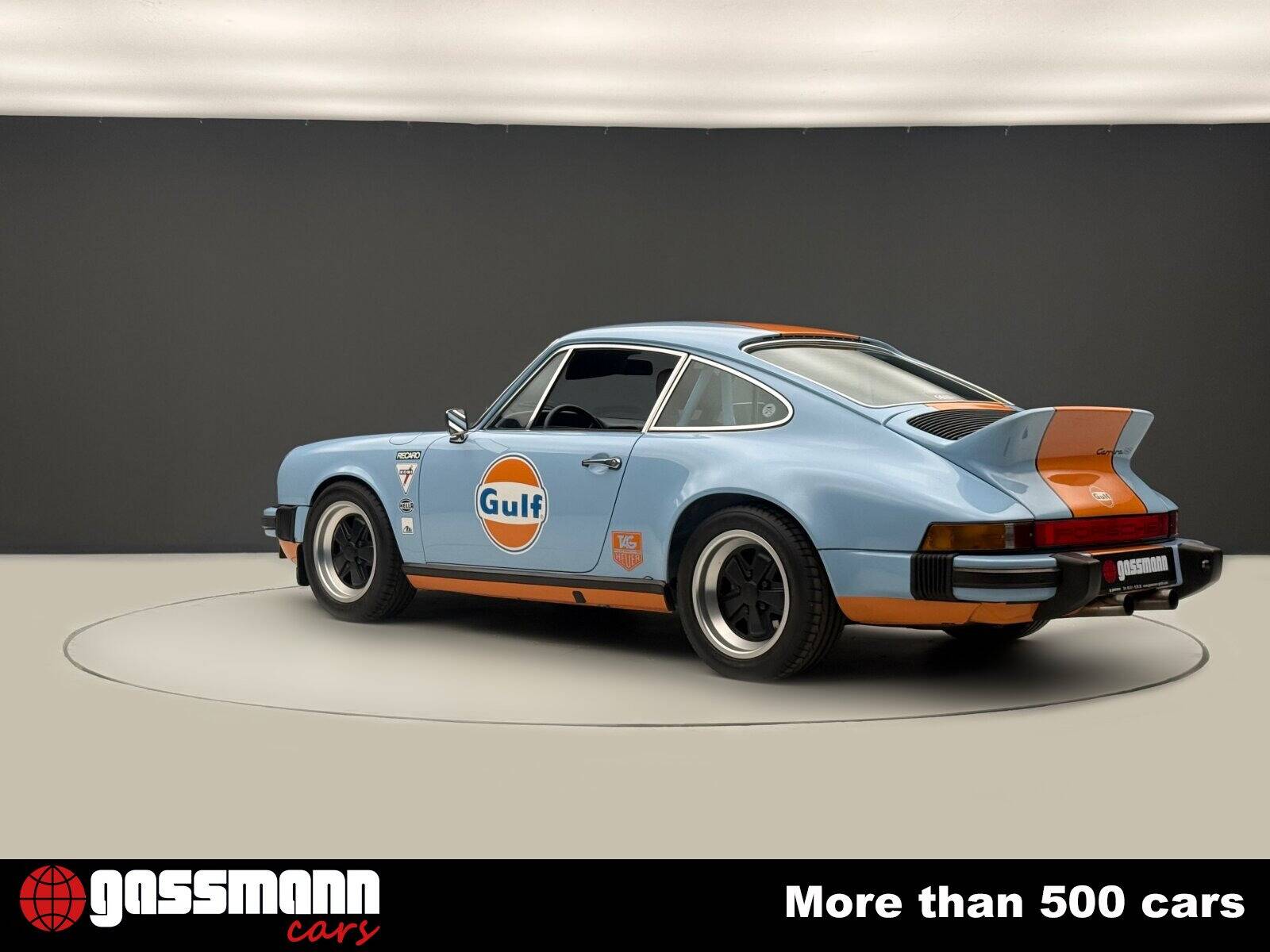 Zum Verkauf steht ein außergewöhnlicher Porsche 911 S 2.7 Coupé aus dem Jahr 1977, präsentiert in einer spektakulären Gulf-Optik in Babyblau/Orange eine Hommage an die legendären Rennsportfarben.